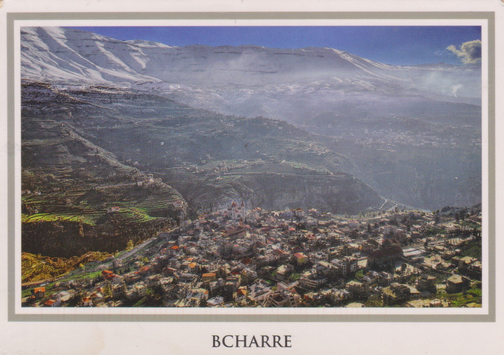 Aerial view of Bcharre, Lebanon - location of Cedars of God which is a UNESCO World Heritage site. Thanks to Nassib. Not sure why there is Lebanon stamps used but there a USA Texas postal cancellation.